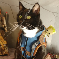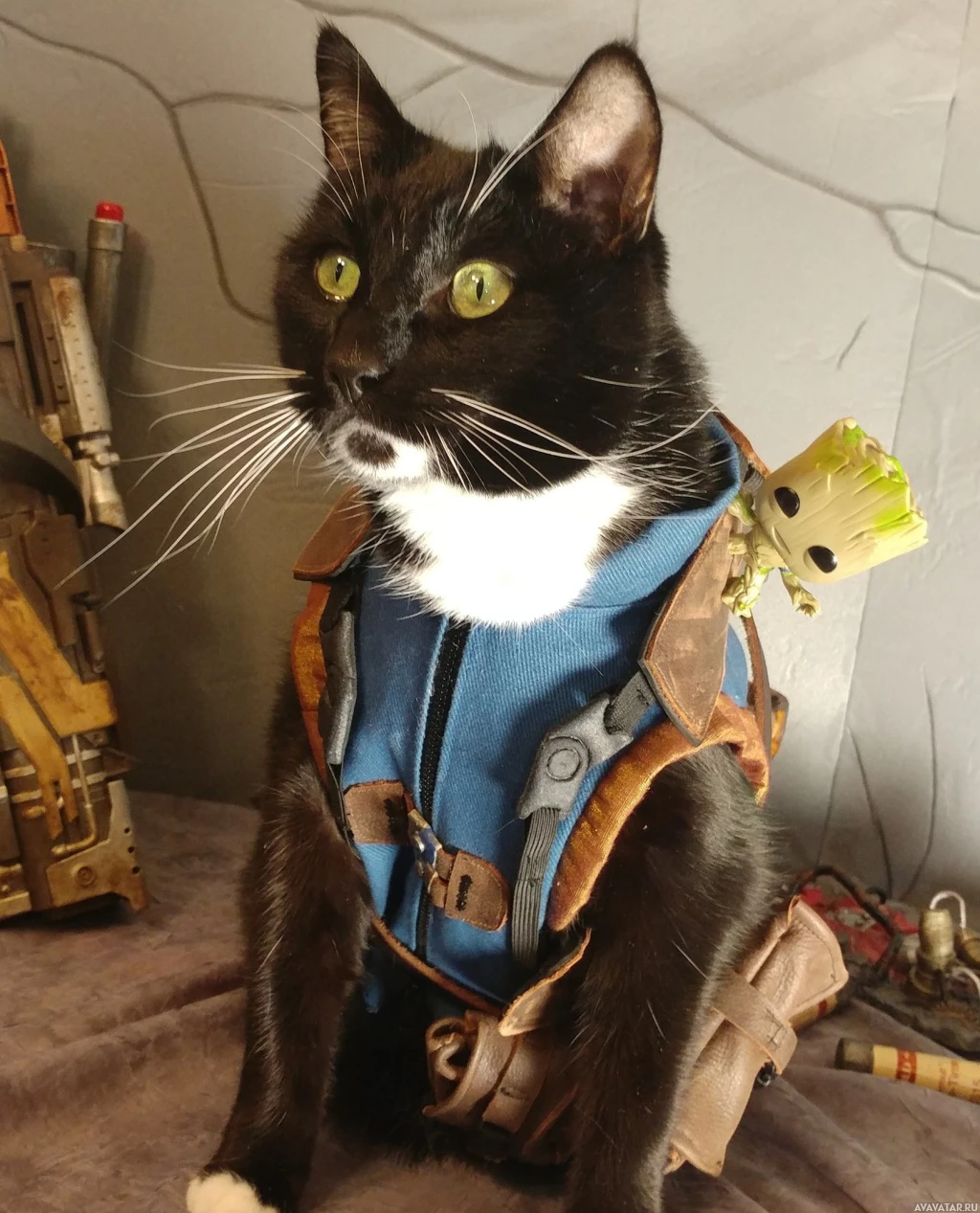 a blue jacket with brown straps and buckles, resembling the vest that Rocket Raccoon is known for wearing in the films. The cat has its fur clipped to match the appearance of Rocket Raccoon's hair style and coloring. On top of the costume, there is