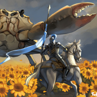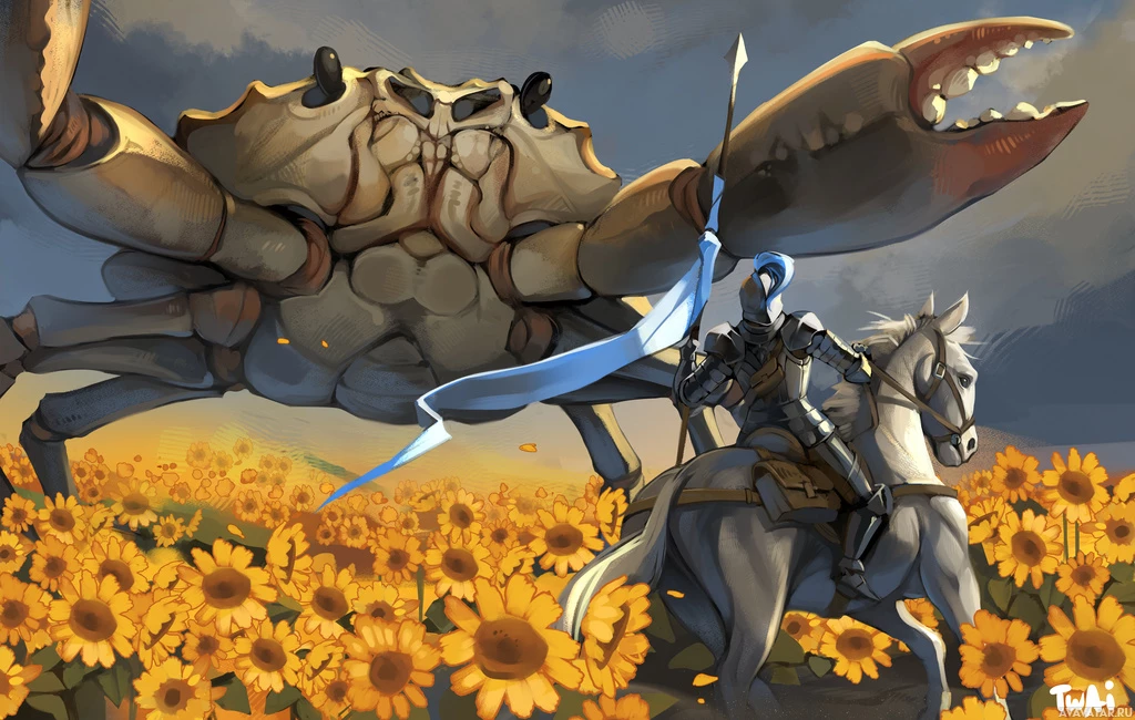 a fantasy scene with a warrior riding on the back of a horse. The warrior is holding a lance and appears to be charging towards an oversized crab that occupies a significant portion of the image, suggesting it might be a creature or monster from this