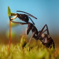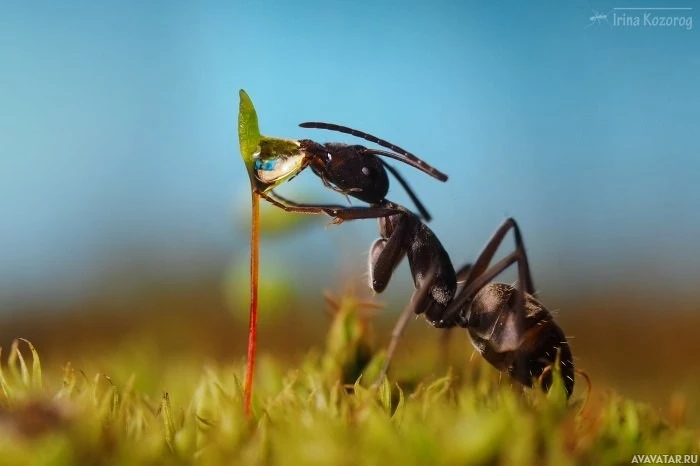 a natural setting with clear skies and bright lighting. The focus of the photograph seems to be the interaction between the ant and a young plant shoot it's biting into, illustrating its