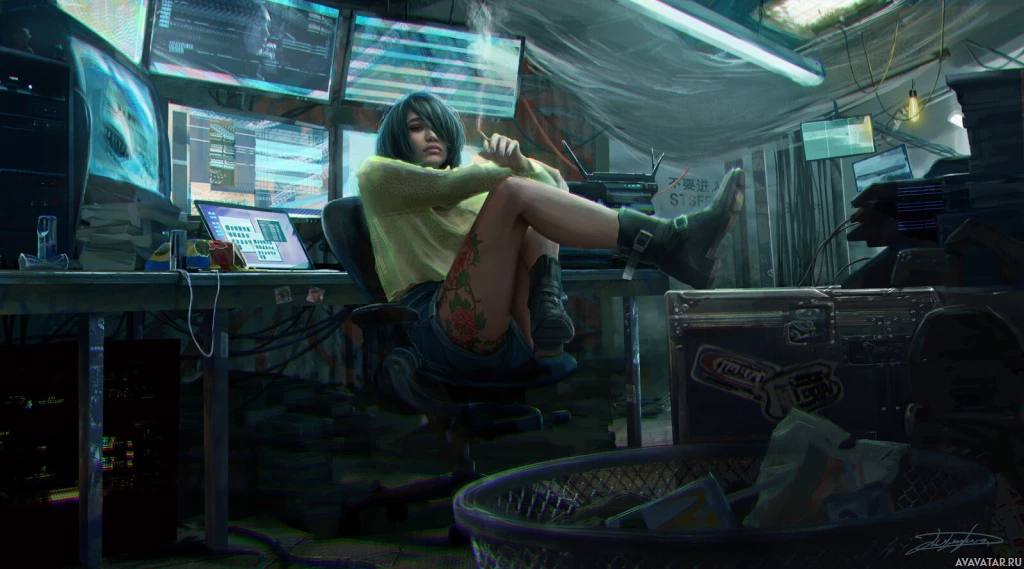 dark hair and is wearing casual clothing with visible tattoos on her right arm. In the background, there are various electronic devices such as monitors, keyboards, and possibly servers or networking equipment, which suggests that this could be