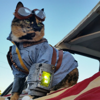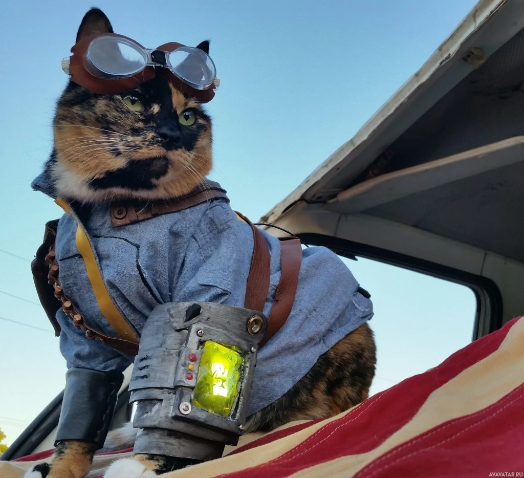 video game series. The cat is wearing goggles and has a bandana or scarf tied around its neck, which adds to the costume's thematic cohesion. The background shows a vehicle with