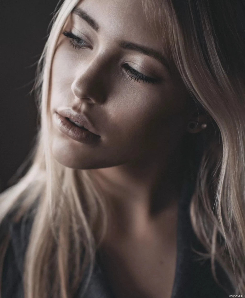 The picture features a woman with blonde hair. She appears to be in a contemplative or introspective mood, as she is looking down with her hand near her face. The lighting is soft and warm, giving the image a gentle and serene feel.