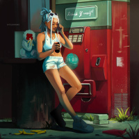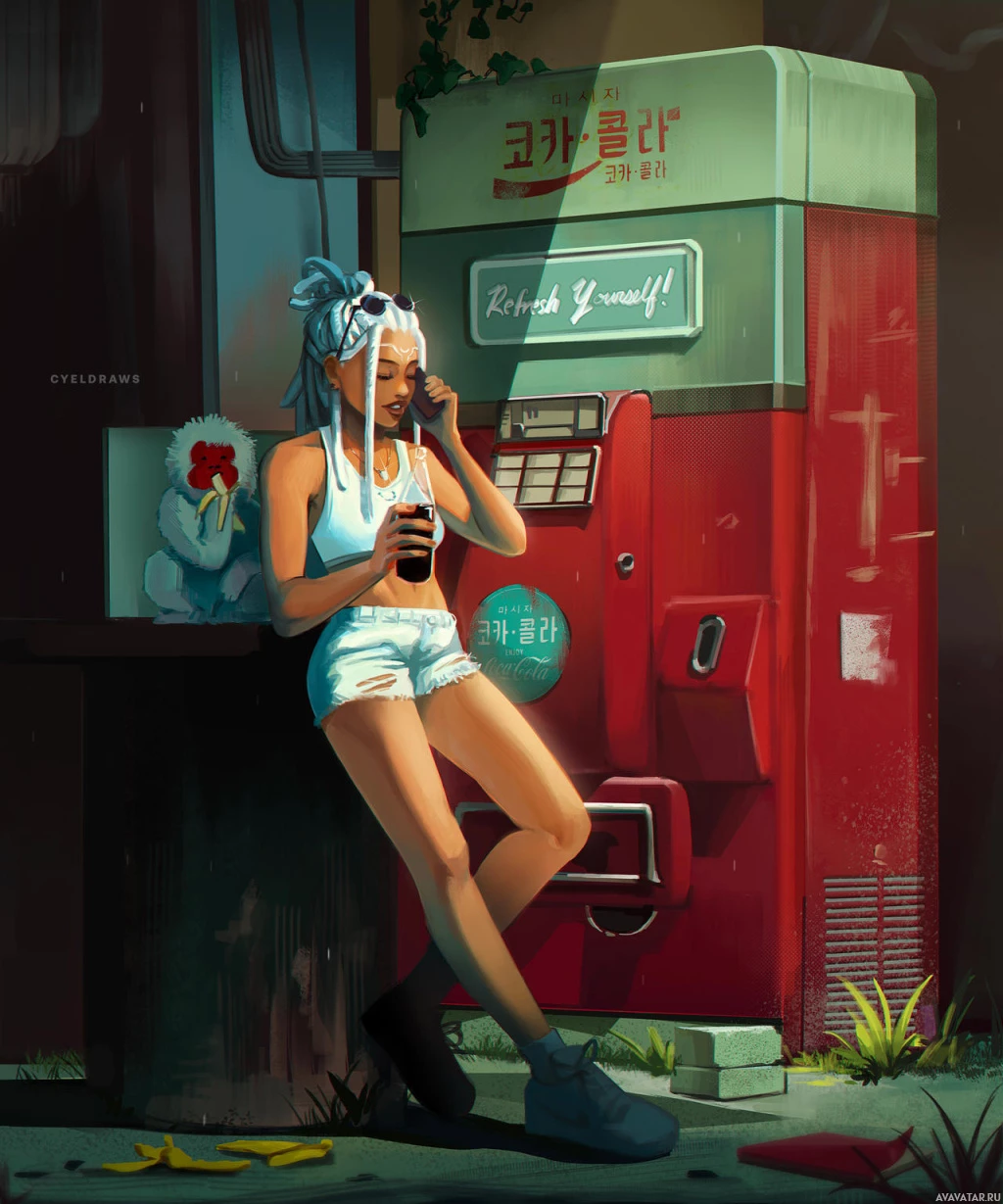soda machine, which adds a retro feel to the scene. The girl seems relaxed or possibly waiting for someone. There is also a bird perched nearby and