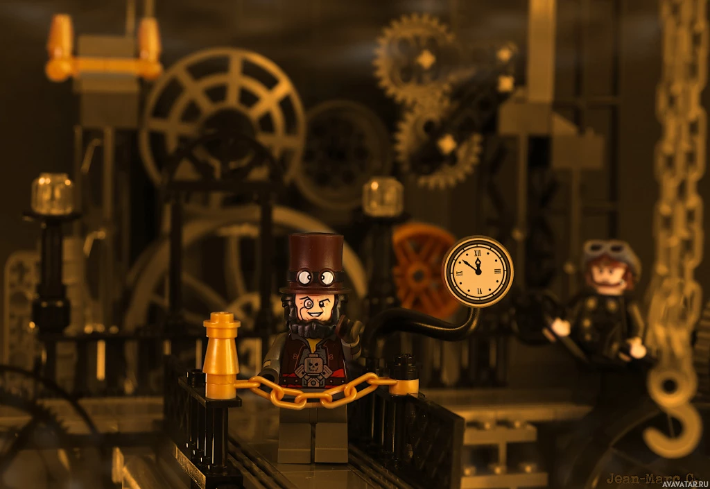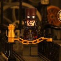 a Lego scene with various elements that seem to be inspired by steampunk or industrial designs. There is a character resembling Jack the Ripper, identifiable by his