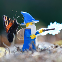a LEGO figure, which appears to be a mage or wizard character, holding what looks like a wand that is emitting blue sparks. The butterfly with vibrant orange and black wings is perched on