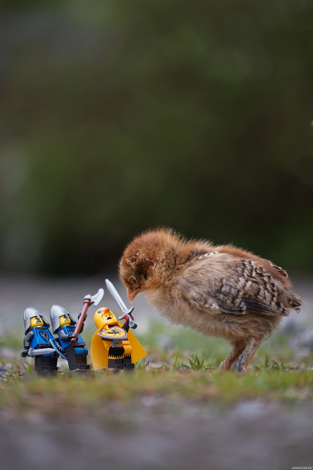 Lego figures seem to be part of an imaginative scenario involving a sword, suggesting that the chick is being "attacked" by these plastic characters. It's