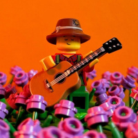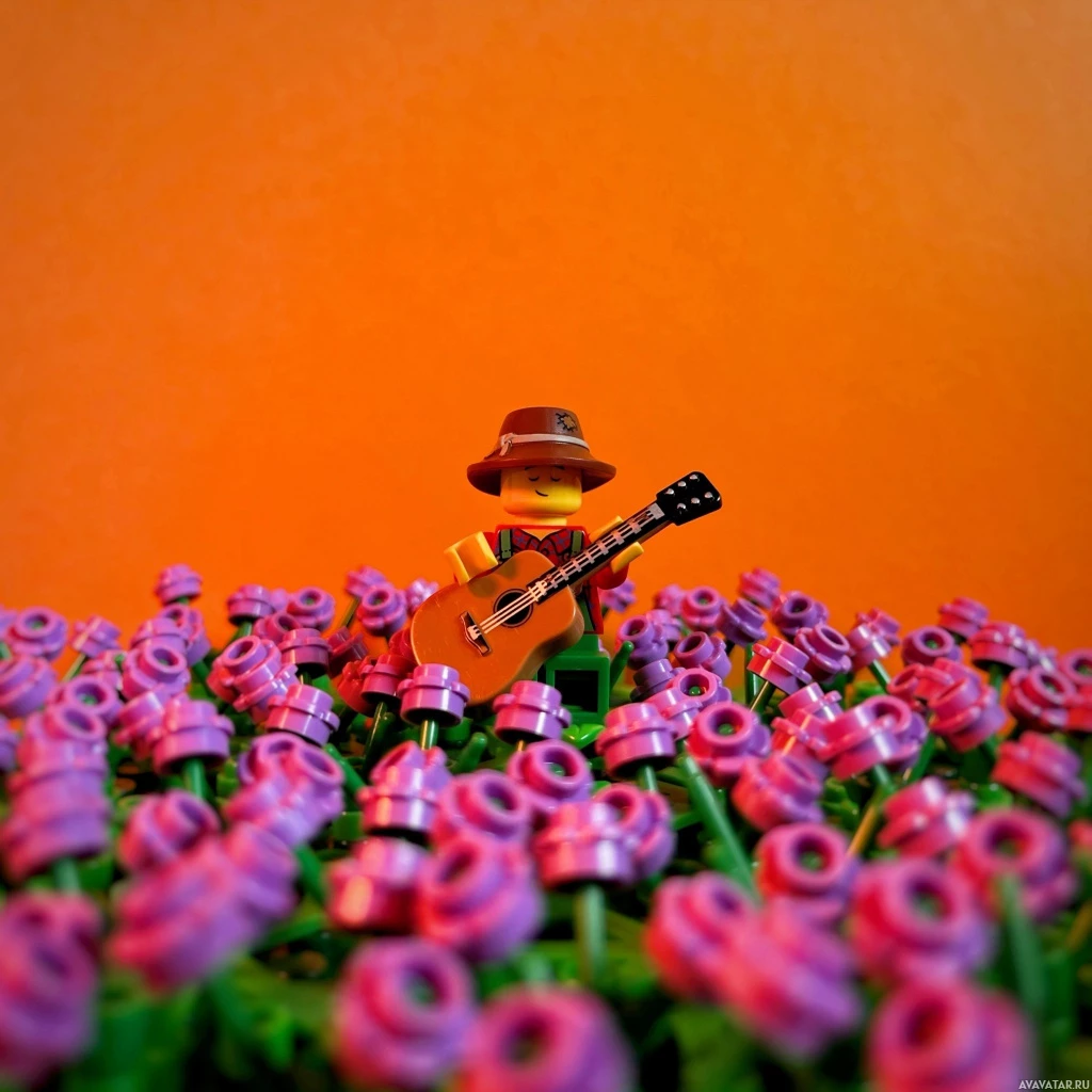 На картинке изображена фигурка из конструктора Lego, которая, похоже, носит шляпу и держит гитару. Фигурка сидит среди чего-то похожего на фиолетовые цветы, возможно, лаванды или других подобных цветов. Фон имеет оранжевый оттенок, который контрастирует с фиолетовым цветом цветов, создавая теплую атмосферу.