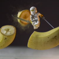 Lego figure has one leg extended forward and the other bent at the knee, while holding the sword with both hands outstretched. The bananas appear to be real fruits cut open along their length, and there's