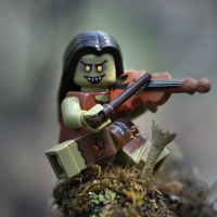 The image shows a small figurine or Lego character playing a violin. It's set against a natural background that suggests it is outdoors, possibly near a body of water given the presence of moss and a puddle in the foreground.