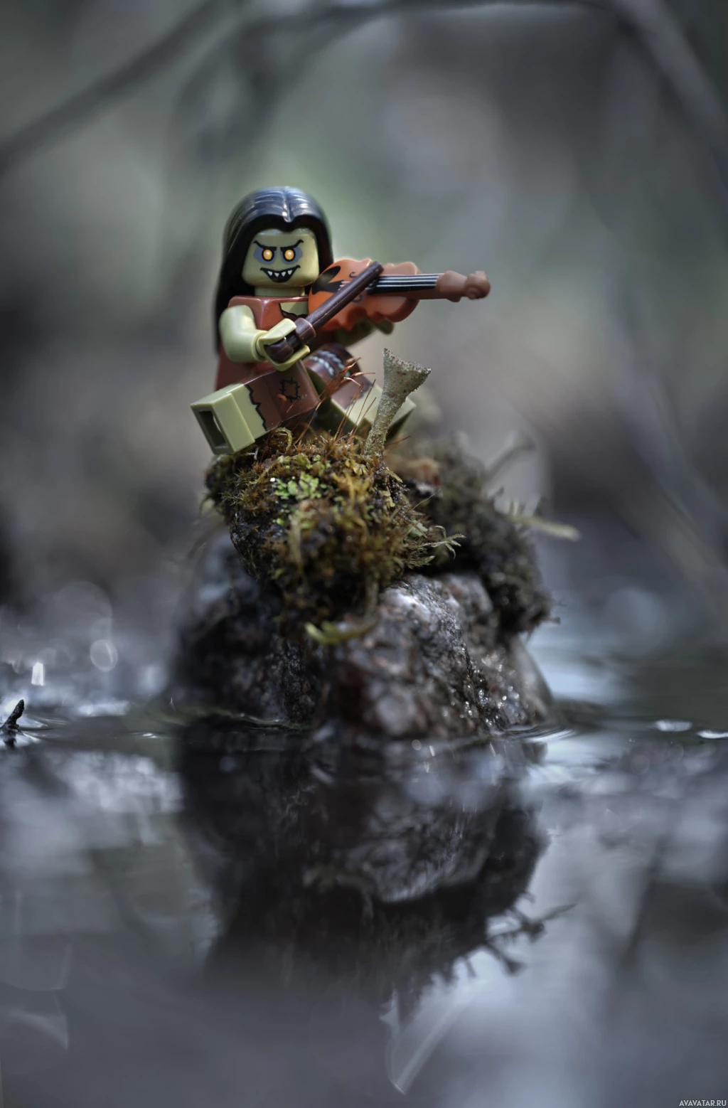 На картинке изображена маленькая фигурка или персонаж Lego, играющий на скрипке. Снимок сделан на естественном фоне, что позволяет предположить, что он находится на открытом воздухе, возможно, рядом с водоемом, учитывая наличие мха и лужи на переднем плане.