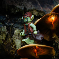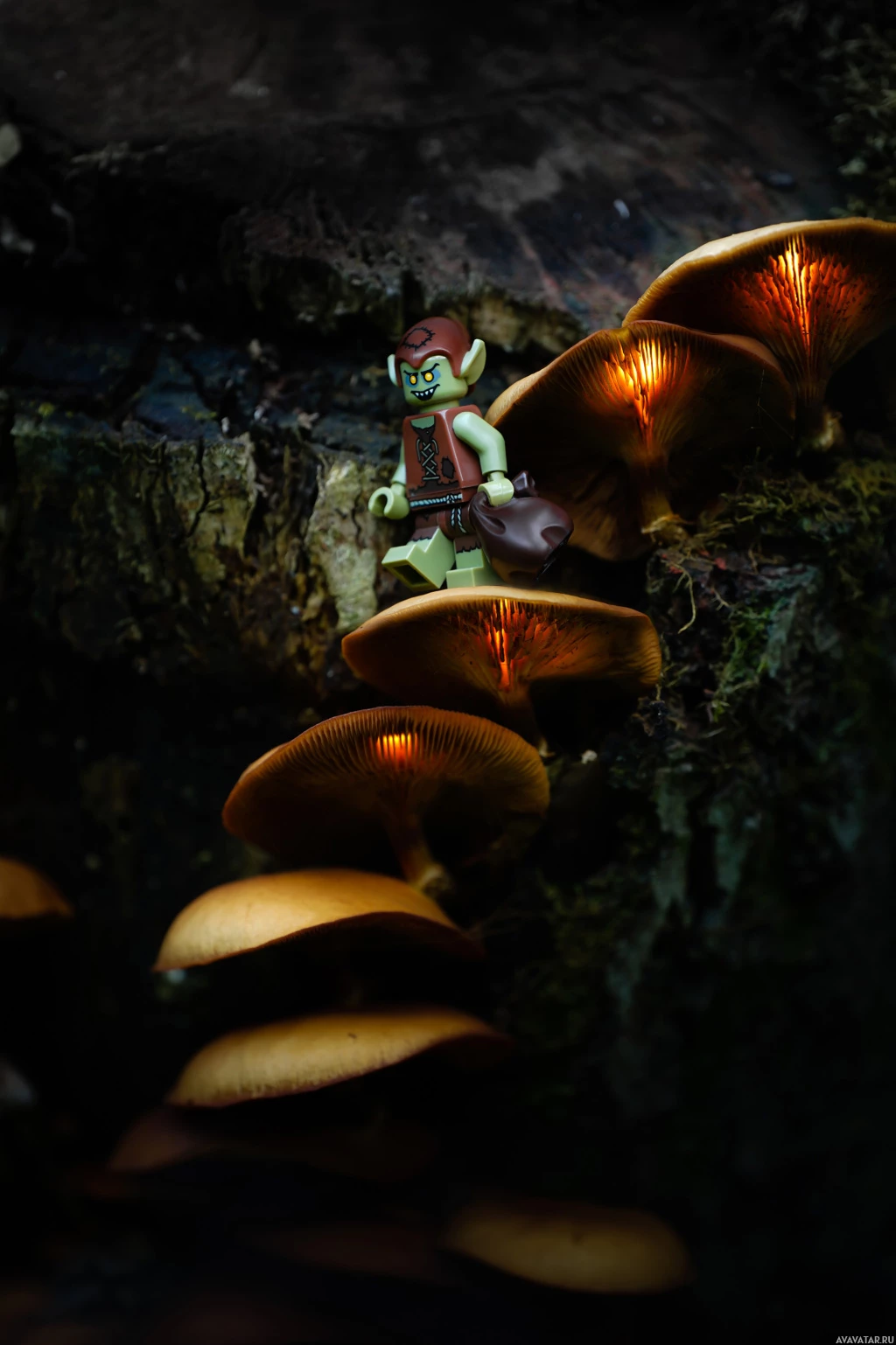 На картинке изображена маленькая фигурка из конструктора Lego, стоящая на вершине нескольких грибов. Фон темный, что выделяет фигурку и выделяет ее в кадре. Также есть другие грибы поменьше и, возможно, немного листвы или камней вокруг, что создает естественную обстановку, которую можно интерпретировать как лесную сцену.
