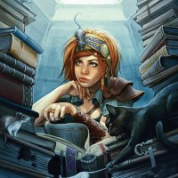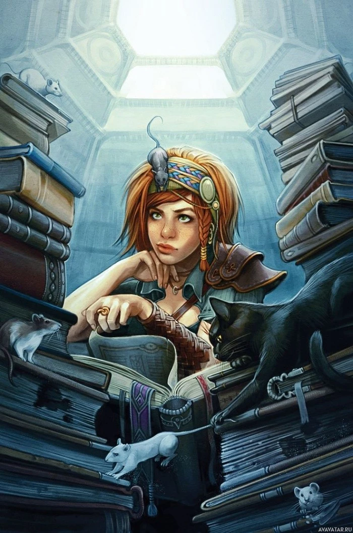an attentive expression and is accompanied by two cats. The scene appears to be set in a room with a somewhat ancient or fantasy-themed atmosphere, as suggested by the architectural style of the bookshelf and the overall aesthetic of the image. There's no rat visible in this picture, so it doesn't appear to match that tag.