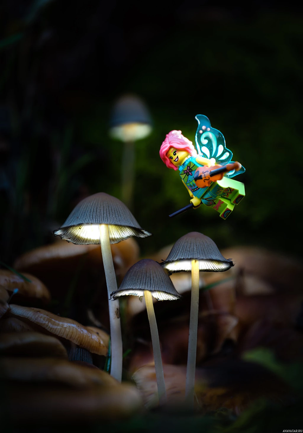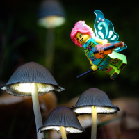 a fairy character made out of Lego bricks, which has been designed to look like it's floating above the mushrooms. This is an example of stop-motion animation where the scene is set up with