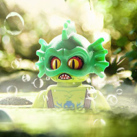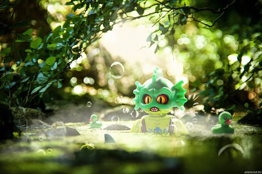 На картинке изображен анимационный персонаж, который выглядит как стилизованный симпатичный монстр. Этот персонаж не из Lego, но скорее напоминает что-то из видеоигр или анимации, учитывая его мультяшный стиль и причудливое выражение лица. Обстановка напоминает окутанный туманом лес, сквозь деревья которого проникает свет, что придает ему несколько волшебную атмосферу.