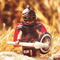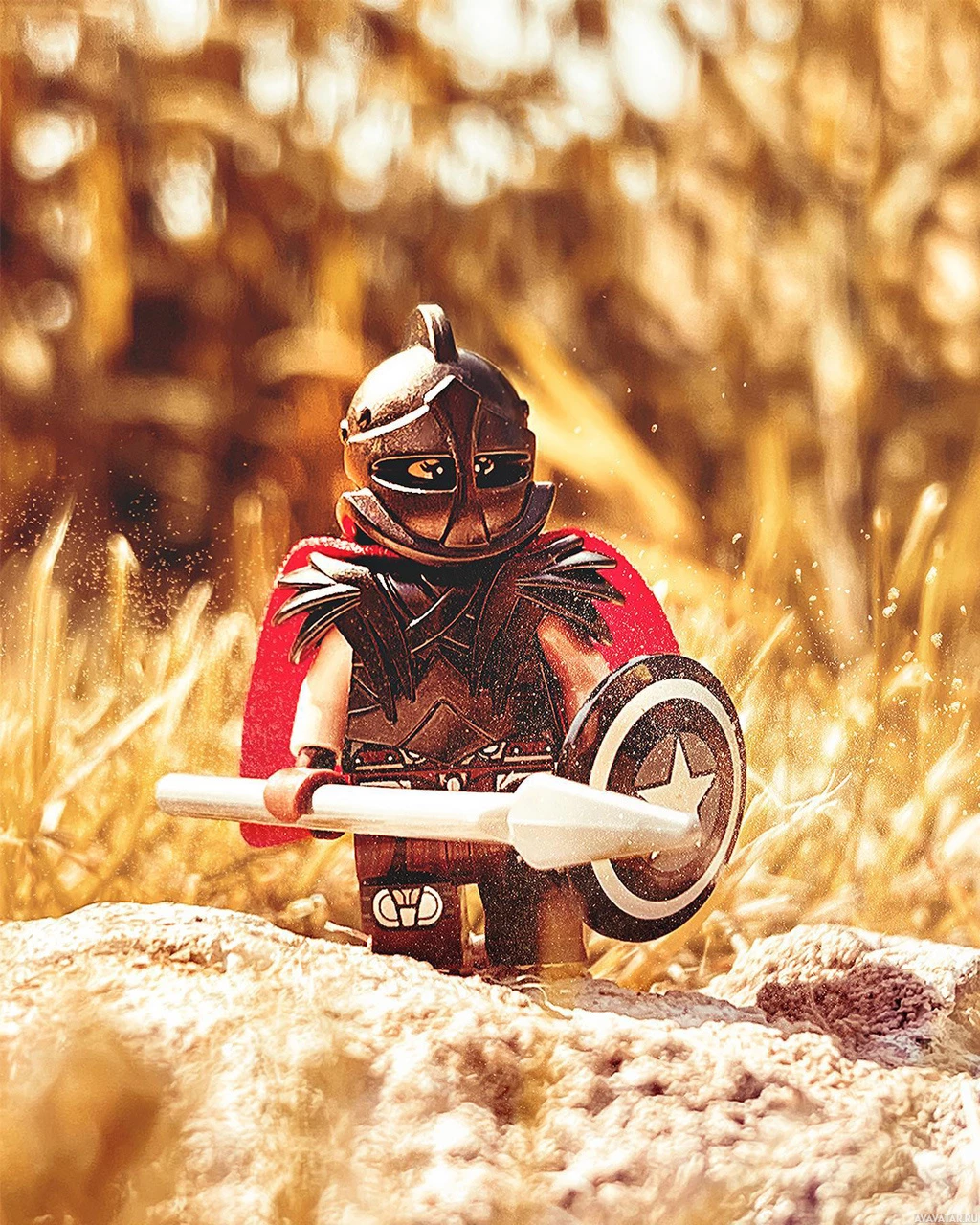 a Lego figure designed to resemble a warrior, possibly inspired by the character Achilles from Greek mythology. The Lego warrior is depicted holding a lance and appears to be charging forward, with dust or sand kicked up around its feet, giving