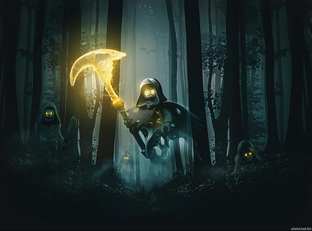 a humanoid figure wearing a cloak and holding what seems to be an axe with a glowing head. Surrounding this central figure are several smaller figures, which might be creatures or characters from the horror theme of the movie. The atmosphere of the image is eerie and unsettling, fitting for a scene that could be interpreted as a part of