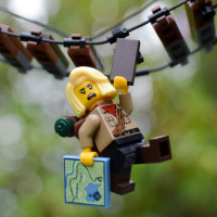 Lego figure has been creatively posed so that it seems to be hanging on a cable or rope, as if suspended in mid-air. The figure is holding what looks like a smartphone or a small