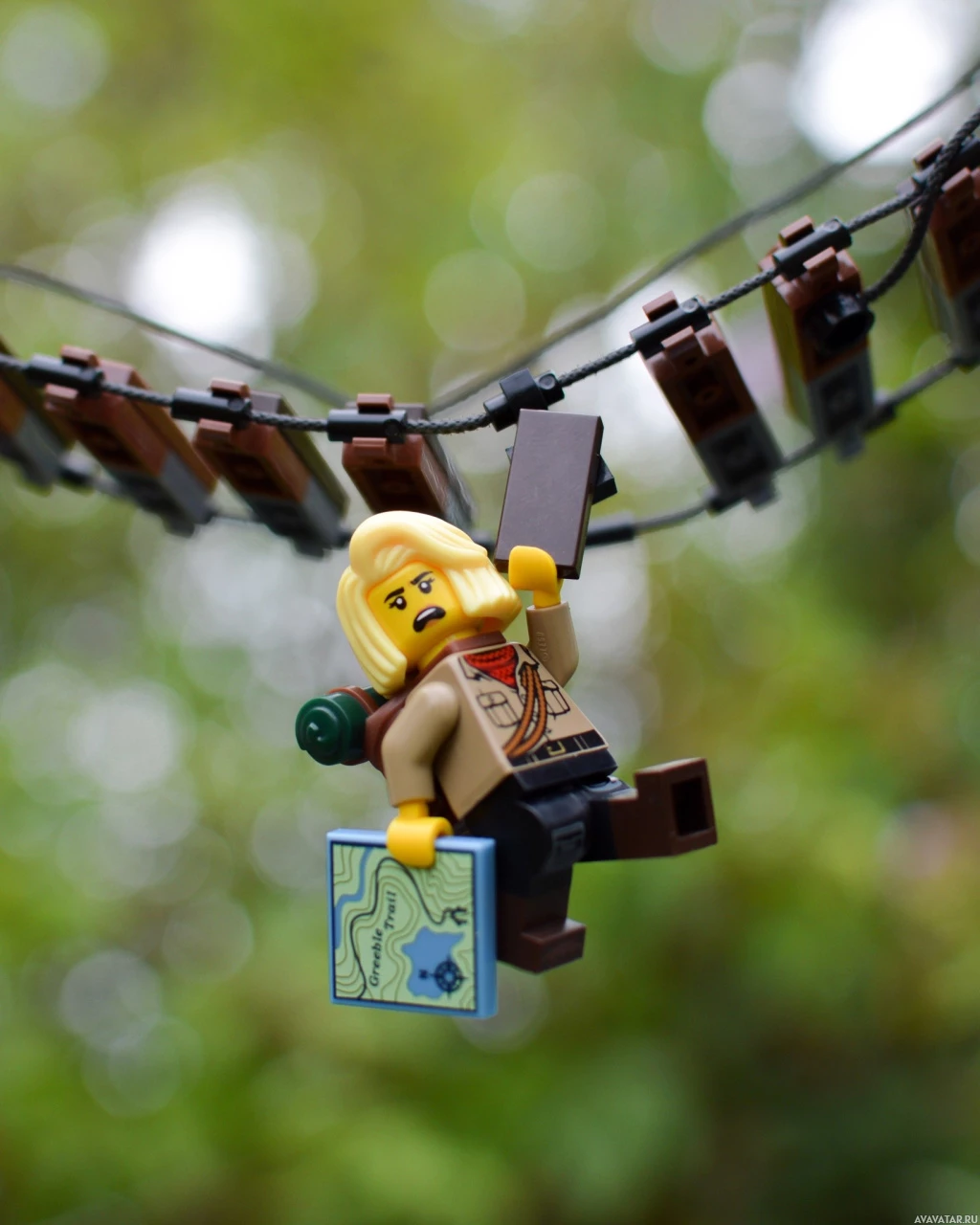 outdoor setting with trees and foliage, providing a contrasting environment for the Lego character's adventurous pose.