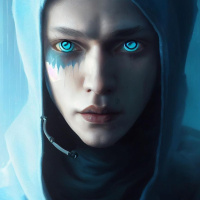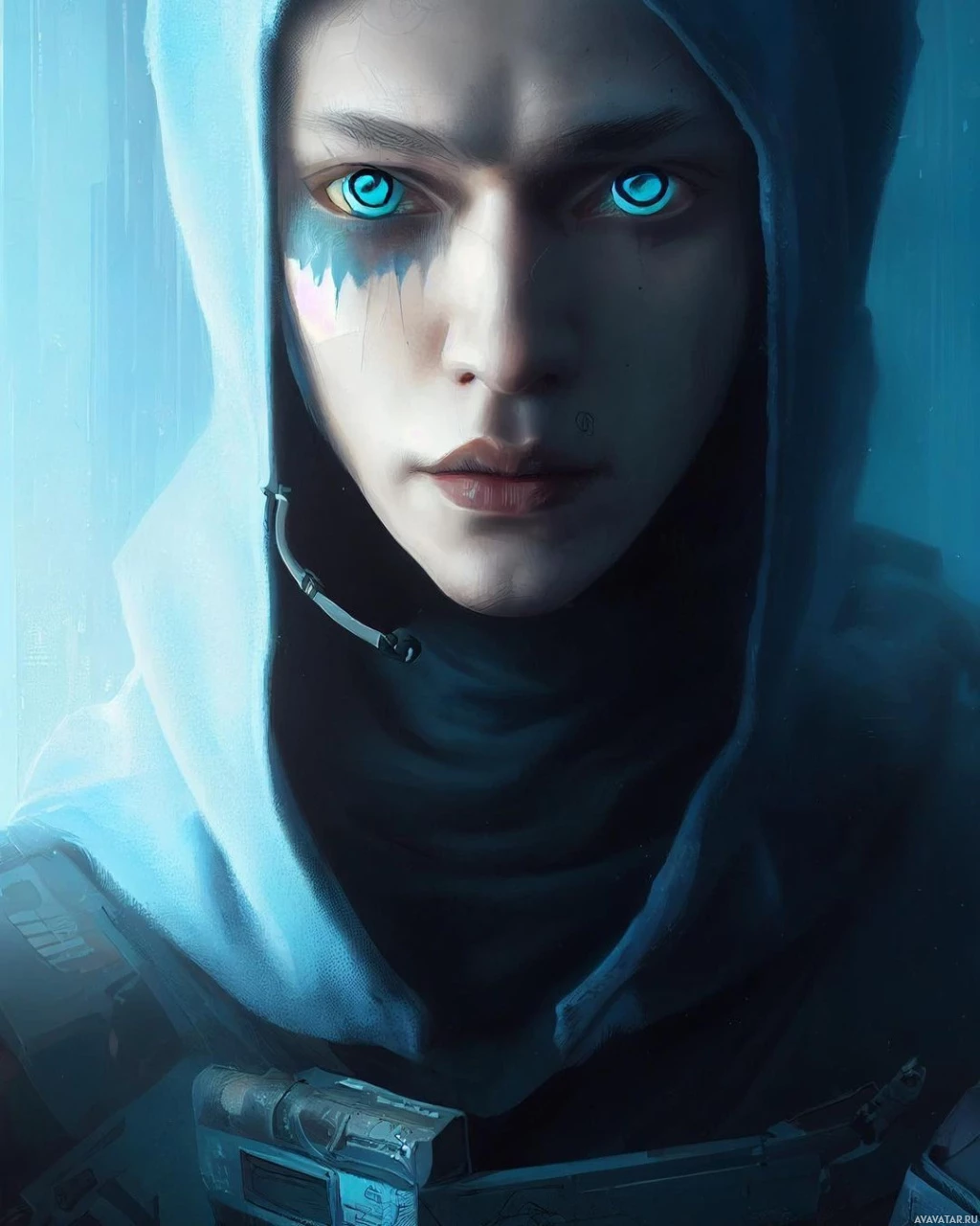 blue eyes. She has an electronic or cyberpunk theme, featuring futuristic elements such as a hood and what looks like a visor with screens or interfaces. The background is abstract but suggests a high-tech setting, possibly related to