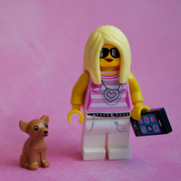 The image features a Lego minifigure that resembles a girl with blonde hair, and another Lego figure representing a dog. They are placed on a pink surface, which appears to be a tablecloth or backdrop for the photograph.