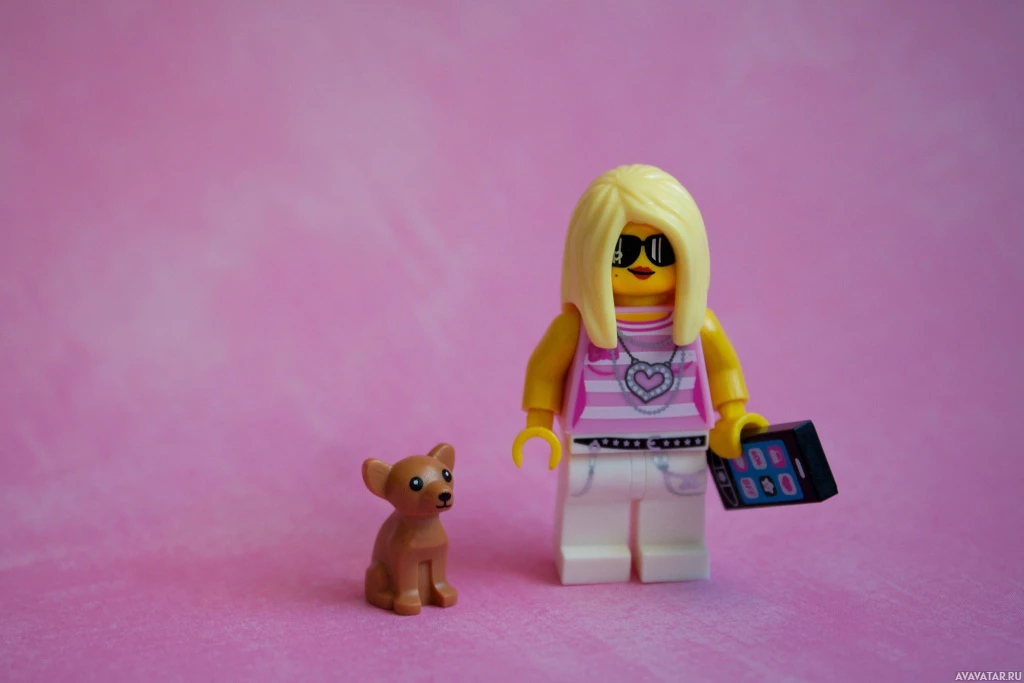 На картинке изображена минифигурка Lego, напоминающая девушку со светлыми волосами, и еще одна фигурка Lego, изображающая собаку. Они размещены на розовой поверхности, которая, по-видимому, служит скатертью или фоном для фотографии.