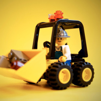 The image shows a Lego Technic construction vehicle set, which includes a yellow and black toy tractor with large front wheels, a loading bucket on the rear, and a figure sitting in the driver's seat.