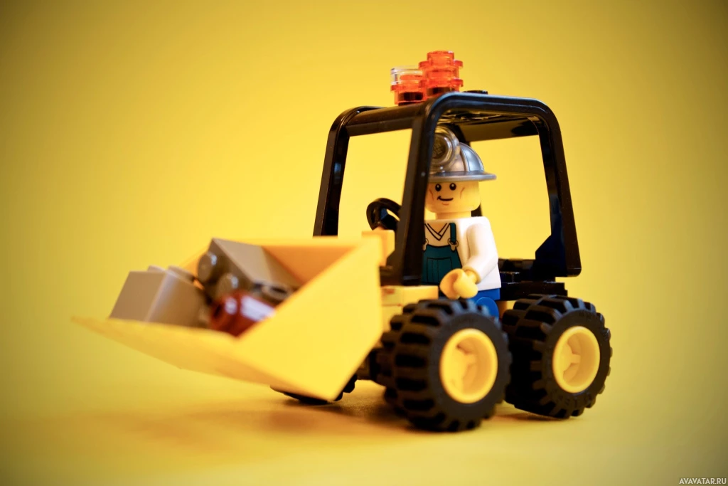 На картинке изображен набор строительных машин Lego Technic, который включает в себя желто-черный игрушечный трактор с большими передними колесами, погрузочный ковш сзади и фигурку, сидящую на водительском сиденье.