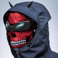 a skull mask with red and black features, overlaid with what appears to be futuristic-looking goggles or glasses. They are also wearing