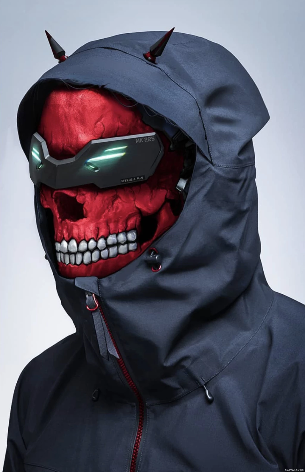 a hooded jacket, which seems to have some sort of futuristic design elements as well, such as the red color accents that match the mask's skull motif. The overall look suggests