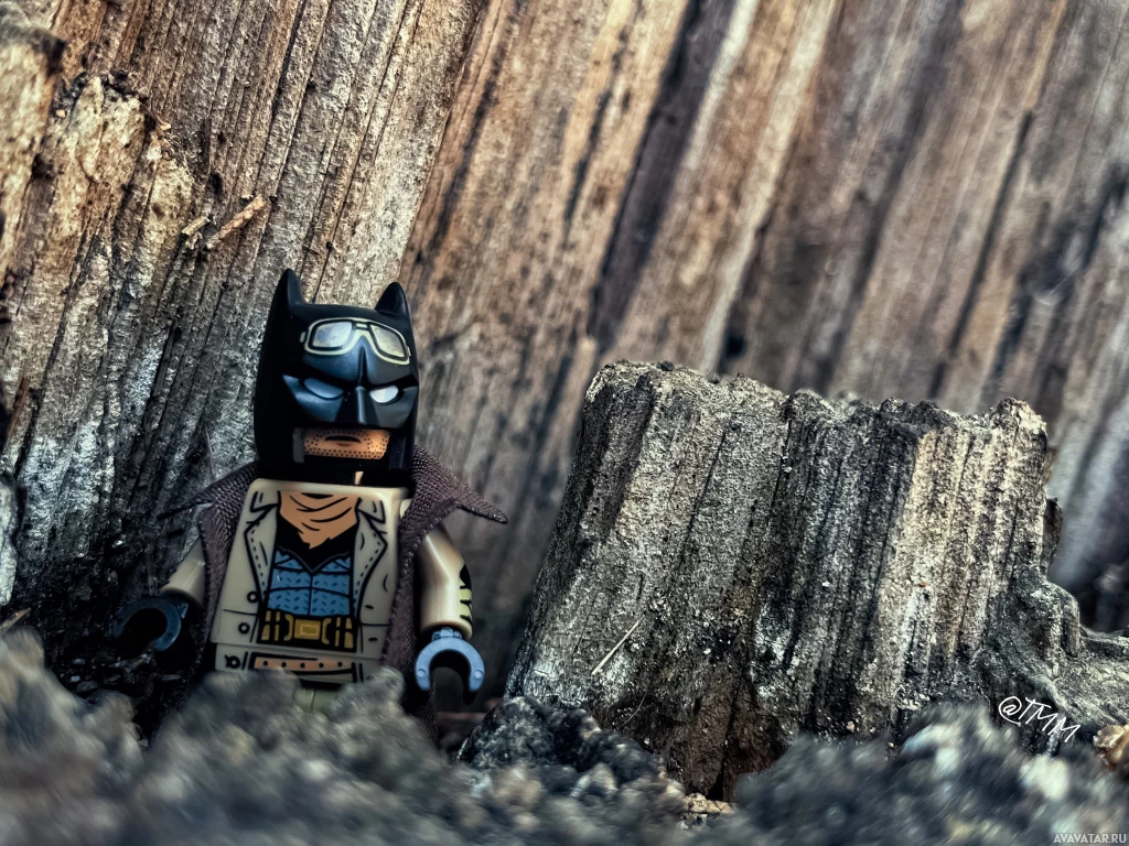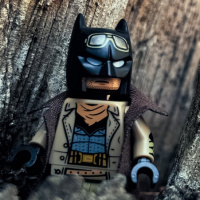a Lego figure, which appears to be a custom-made version of Batman. It is placed in a setting that looks like