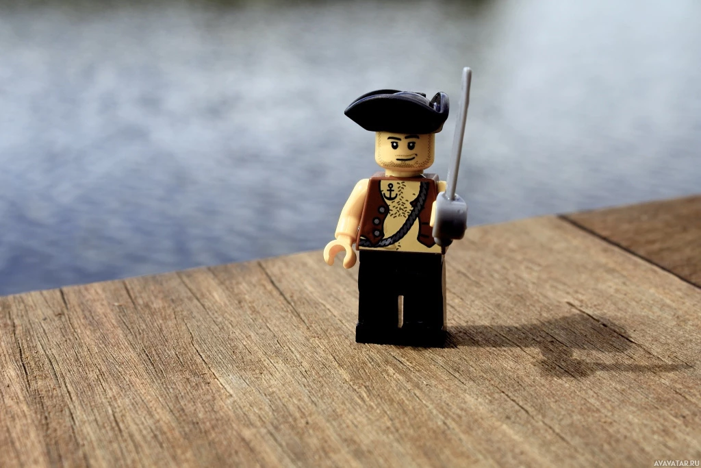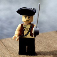 a Lego minifigure of a pirate. This character is holding what appears to be a sword and has a distinctive pirate-like attire, including a hat with a feather, which is often associated with pirates in
