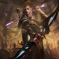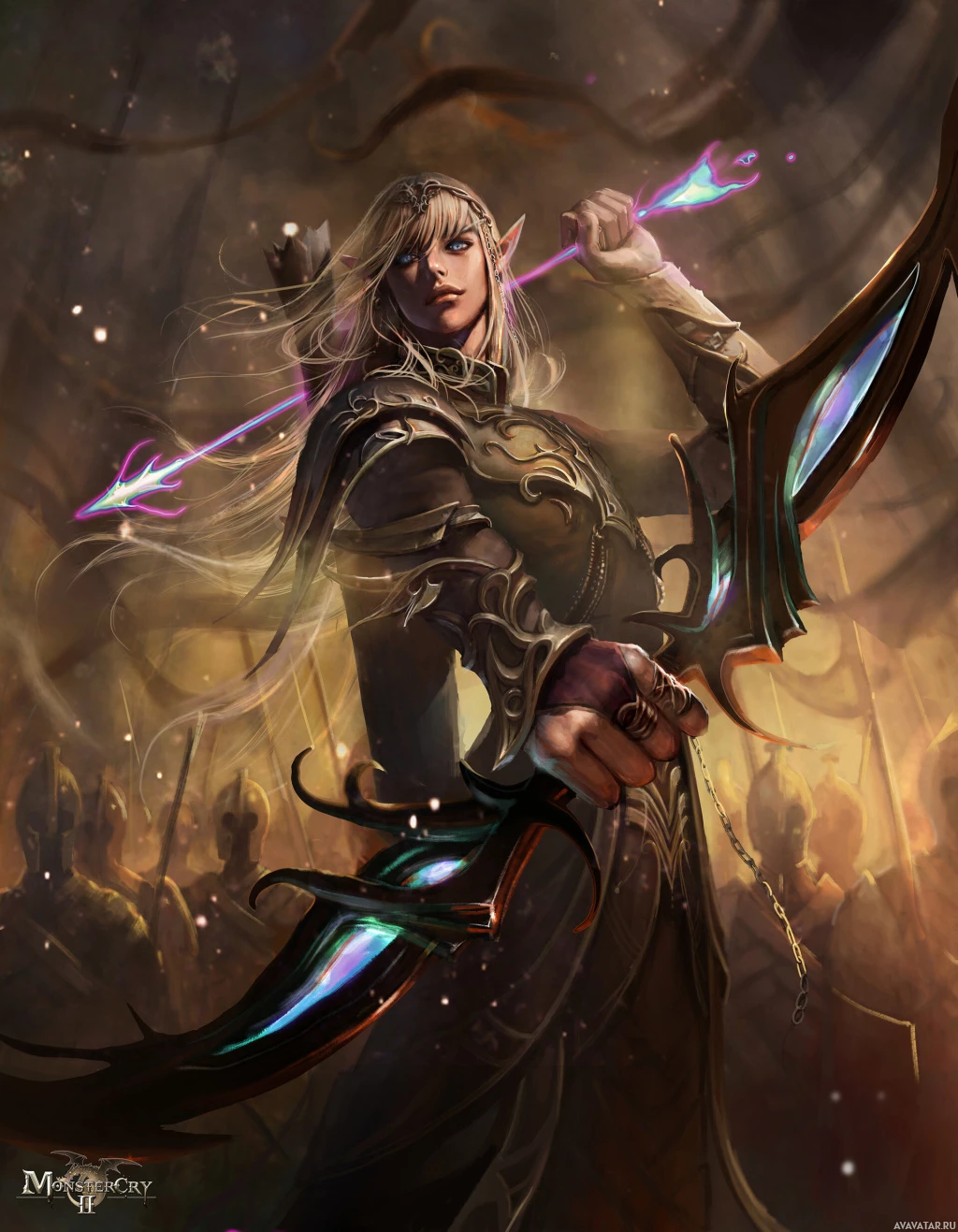 an elven archer. She is holding two bows, one in each hand, and appears to be aiming or preparing for battle. The character has long