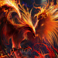 outstretched wings, surrounded by flames. The bird appears to be in motion, as if it is either taking flight or engaging in some kind of