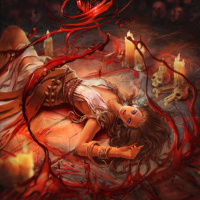 dark liquid splattered around her. Her eyes are closed, suggesting she may be sleeping or experiencing a vision. The setting has