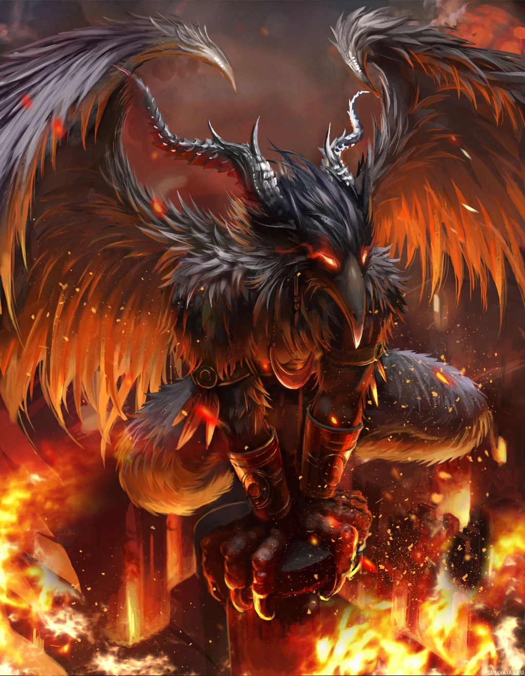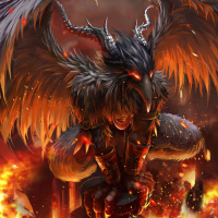 large wings and sharp talons. It appears to have a humanoid upper