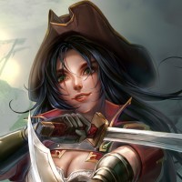 black hair and dark eyes. She is wearing a pirate's hat with a feather in it, and she has a determined expression on her face. In her hands, she holds two