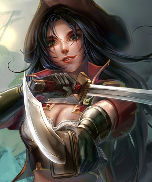 animated character who appears to be inspired by the "League of Legends" game. This character is portrayed as a female pirate with prominent features such as
