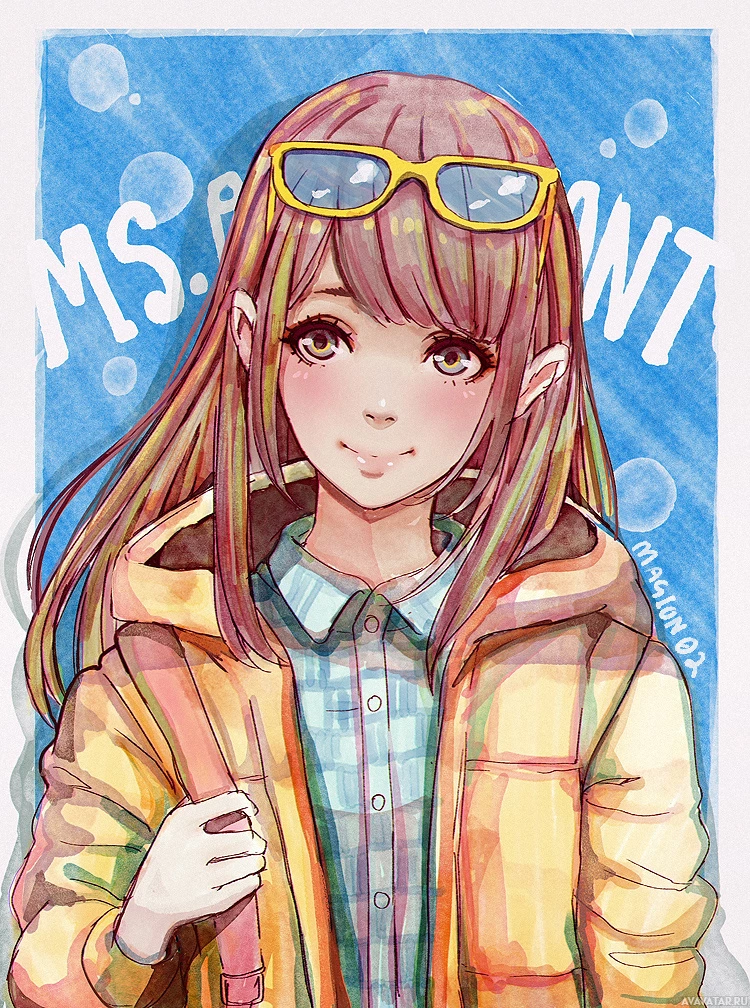 checkered shirt with a collared undershirt, suggesting a casual yet fashionable style. Her attire also includes a jacket that looks warm and weather-resistant. The background features a gradient from blue to white, which could be interpreted as a sky or cloud pattern. On the bottom right corner of the image, there is text that reads "MS PINT," which may indicate that this is an artwork created using MS Paint software, or it could simply be a creative