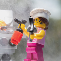 a playful scene with Lego figures. There is a figure resembling a chef, wearing an apron and hat, standing in front of what appears to be a BBQ grill made out of Legos. Another figure, likely