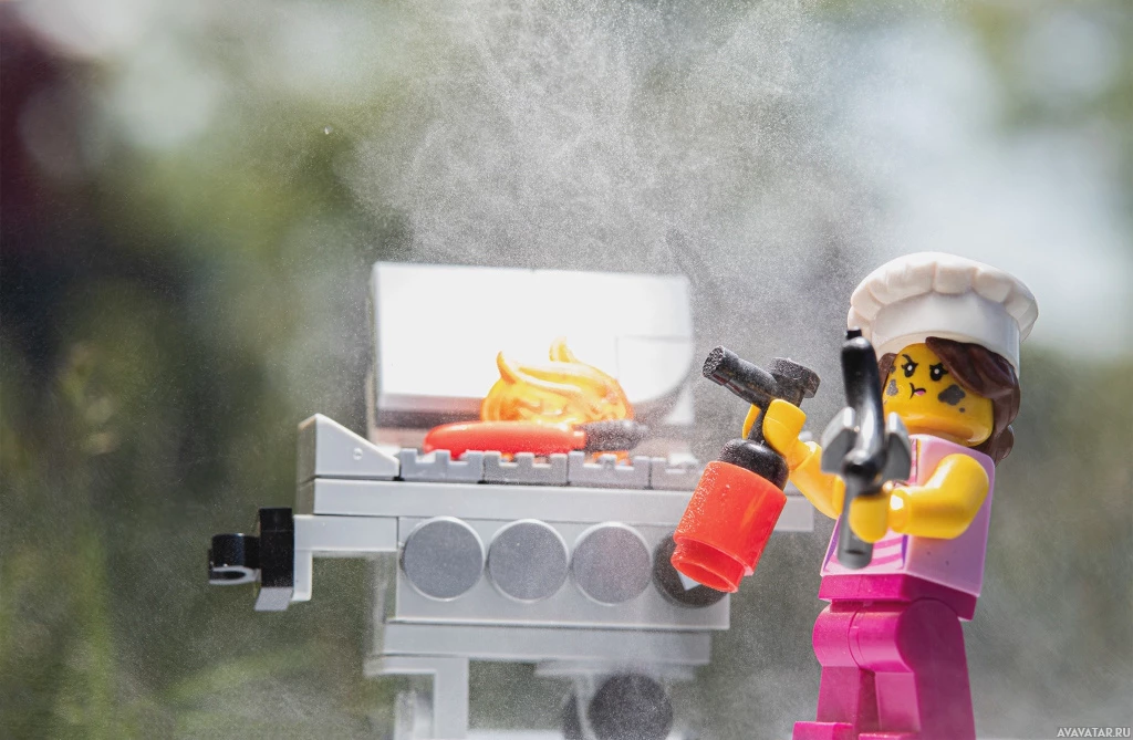 a character from the movie "The LEGO Movie," is holding a spatula, seemingly cooking or pretending to cook on the grill. The background is a bit blurry but it looks like