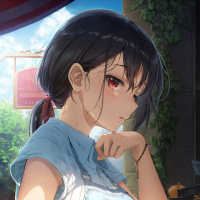 an outdoor setting, possibly a market or street fair, as there are various fruits such as apples and oranges visible in the background, along with what seems to be a stall or booth. The character has