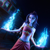 The image features an animated character, a young girl with purple hair, wearing a red outfit. She is casting blue and white magical energy from her hands. This character appears to be from a fantasy-themed video game or animation.