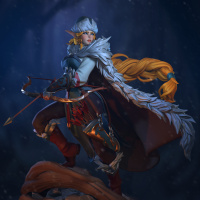 an elf archer, as indicated by the presence of a bow in her hands and the fantastical attire she wears. Her outfit suggests she might be a warrior or huntress, given the armor elements and the quiver full of arrows. The environment appears to be a winter