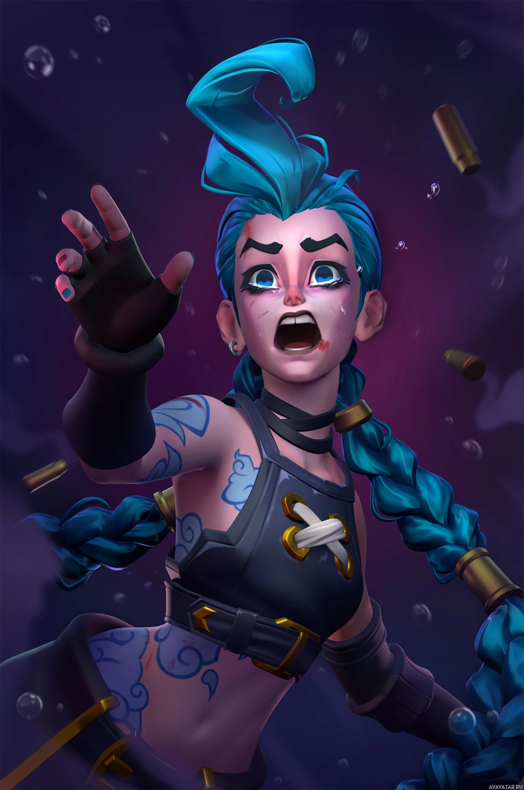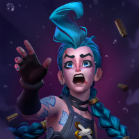 League of Legends." This character is known as Jinx, and she is depicted in her iconic pose with