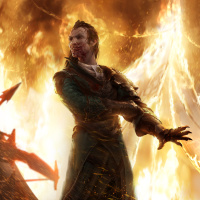 The image depicts a fantasy scene with a character surrounded by flames. The individual appears to be armored and is holding a weapon, which could suggest they are a warrior or guardian of some sort. The setting looks chaotic and intense, possibly indicating conflict or danger within the context of this fantasy world.