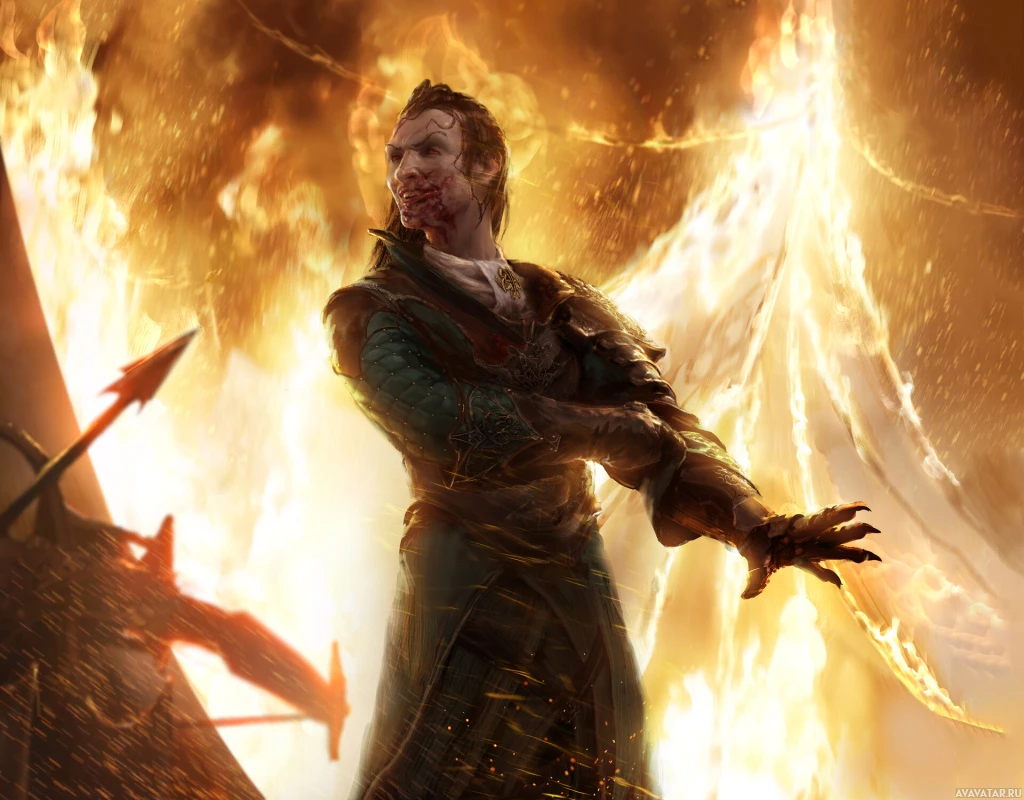 На картинке изображена фантастическая сцена с персонажем, окруженным пламенем. Персонаж, судя по всему, закован в броню и держит в руках оружие, что может свидетельствовать о том, что он является воином или стражем в некотором роде. Обстановка выглядит хаотичной и напряженной, что, возможно, указывает на конфликт или опасность в контексте этого фантастического мира.