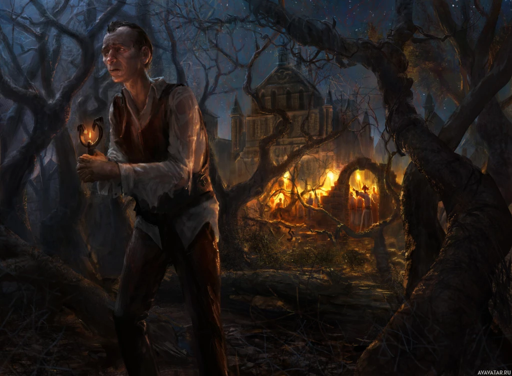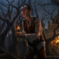 a forest at night. This figure is holding a lantern or torch, which casts light onto