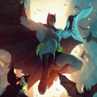 a utility belt with gadgets. He appears to be either flying or swooping downwards among