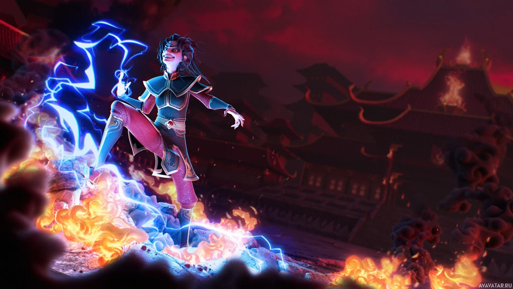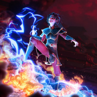 a fantasy setting, seemingly engaged in an action pose with her right arm extended as if casting or striking with lightning. The background features what appears to be flames, suggesting a chaotic environment or combat scenario. The character is wearing a costume that could imply she is a warrior or a wizard of some kind.