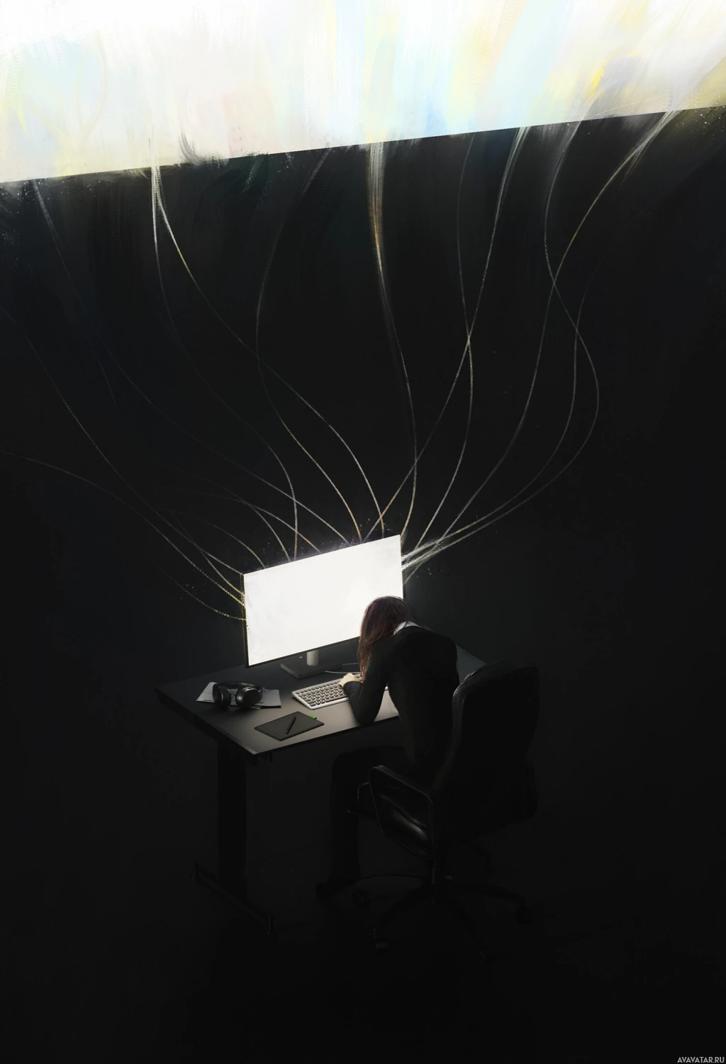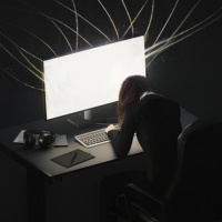 lighting effects around the room. There are also some wires or strands that could be interpreted as electricity or a digital theme, further enhancing the technological atmosphere of the scene.